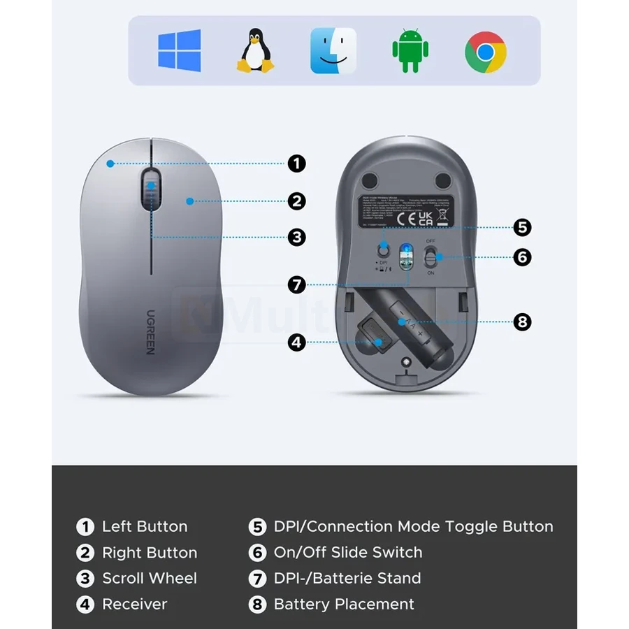 Este mouse inalámbrico de UGREEN está diseñado para brindar una experiencia fluida, silenciosa y versátil. Con conectividad Dual Mode (2.4GHz + Bluetooth), puedes emparejarlo fácilmente con laptops, PCs, tablets o dispositivos móviles sin depender de un solo puerto.
